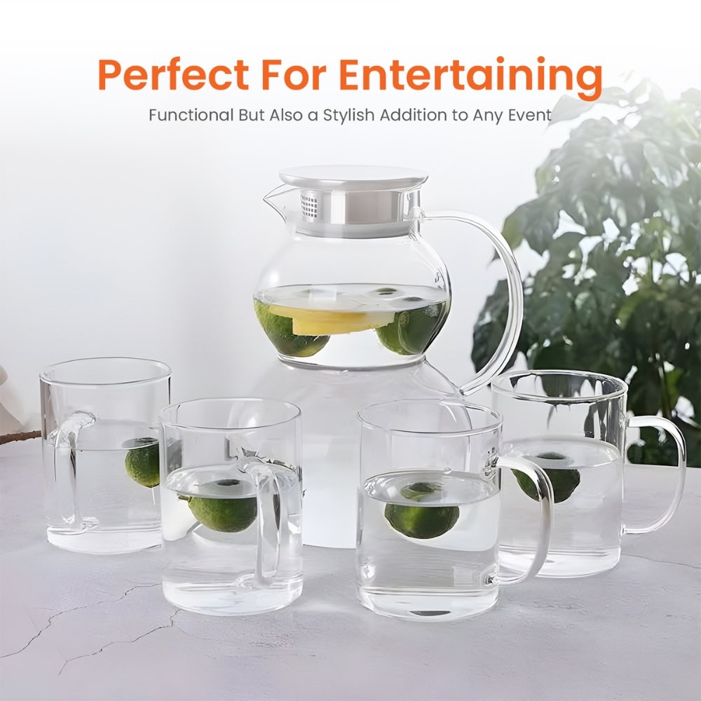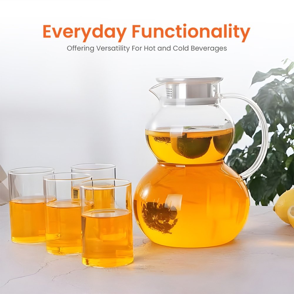 The LANGFOSS 1800ml Borosilicate Glass Pitcher is the perfect addition to any home or office, offering versatility for hot and cold beverages like water, tea, coffee, juice, and fruit-infused drinks. Its durable, high-quality borosilicate glass design includes an anti-drip spout and a comfortable handle for easy pouring. A secure rubber seal around the lid ensures no spills and keeps beverages fresh. With a wide mouth for easy cleaning, it’s dishwasher-safe, though hand washing is recommended to preserve its longevity. Ideal for serving drinks at parties, gatherings, or daily use, this pitcher combines functionality and elegance. It makes a thoughtful and practical gift for anyone who enjoys entertaining.